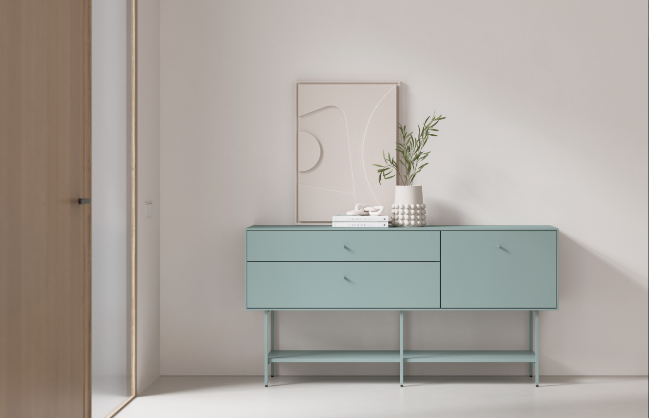 Aparador de salón de diseño moderno compuesto por un estructura baja con 2 cajones y 2 puertas en la parte alta se ha colgado un espejo de 70 Ø.