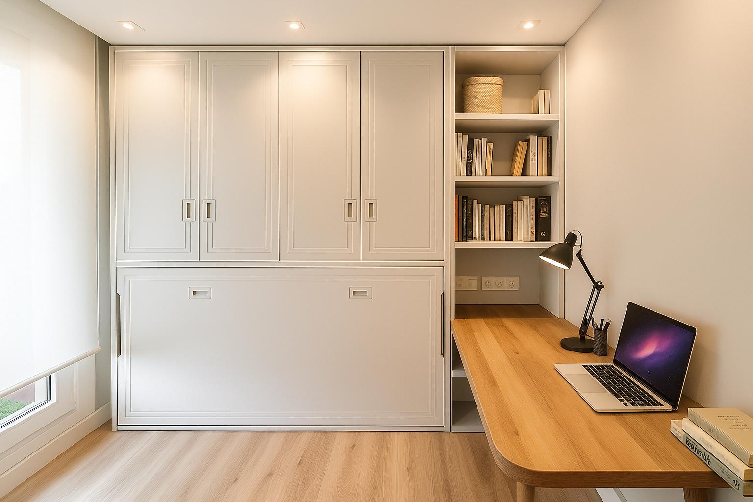 Dormitorio diseñado a medida con una cama abatible lacada con almacenaje en la parte de arriba,al lado una estanteria lacada y la mesa de estudio con forma laminada en color golden