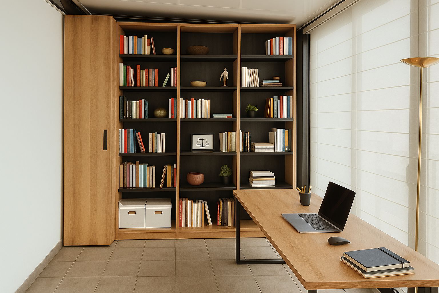 - mesa de trabajo a medida laminada con patas metálicas abiertas