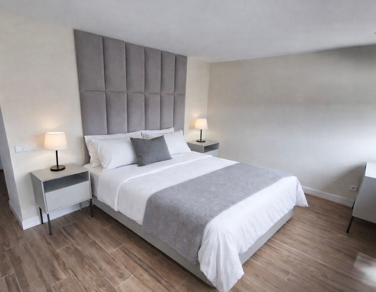 Dormitorio de matrimonio con cabecero tapizado en tapicería gris y mesillas con hueco y cajón con opatas