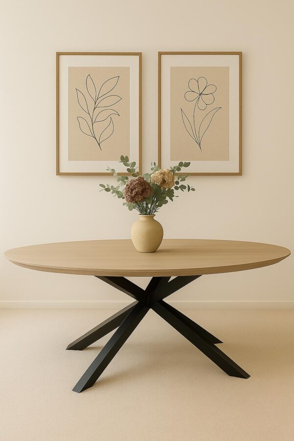 Mesa de comedor ovalada con tapa de madera y base metálica negra