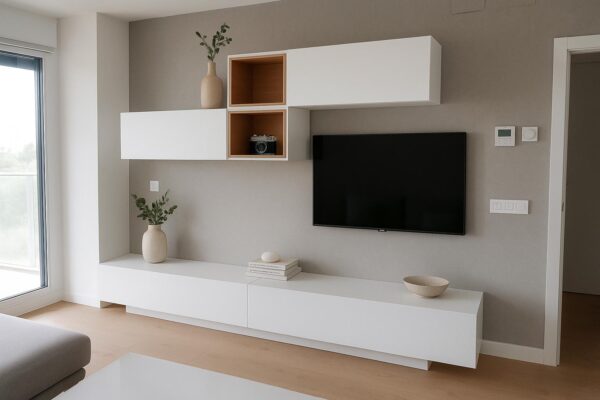 Mueble de salón blanco combinado con cubos roble
